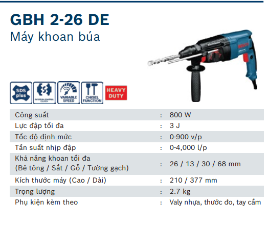 MÁY KHOAN BÊ TÔNG 26MM/800W BOSCH GBH 2-26 DE CHÍNH HÃNG GIÁ TỐT