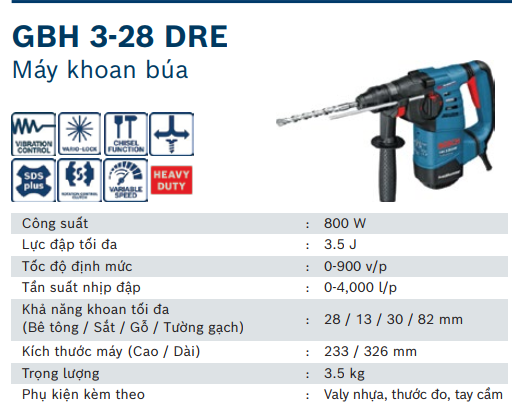 MÁY KHOAN BÊ TÔNG 28MM/800W BOSCH GBH 3-28 DRE CHÍNH HÃNG GIÁ TỐT
