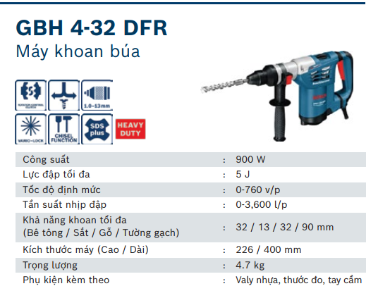 Bosch GBH 4-32 DFR là máy khoan búa đa năng mạnh mẽ nhất phân khúc 4kg. Với công suất 900W và lực đập 4.2J, máy dễ dàng khoan bê tông, đục phá và khoan gỗ/sắt nhờ đầu cặp thay nhanh. Hệ thống chống rung giúp làm việc êm ái, bền bỉ và hiệu quả vượt trội.