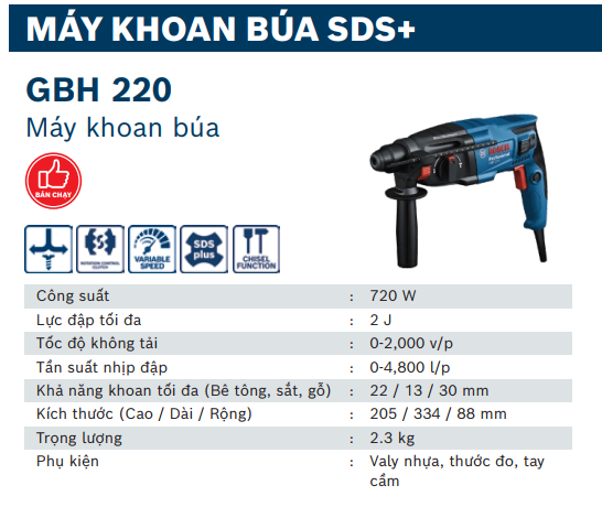 MÁY KHOAN BÊ TÔNG 22MM/720W BOSCH GBH 220 CHÍNH HÃNG GIÁ TỐT