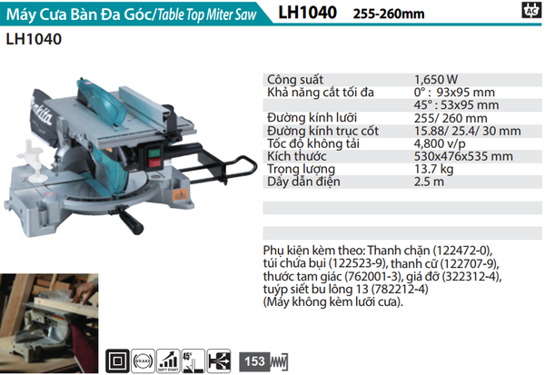 - Phụ kiện kèm theo: Thanh chặn (122472-0), túi chứa bụi (122523-9), thanh cữ (122707-9), thước tam giác (762001-3), giá đỡ (322312-4), tuýp siết bu lông 13 (782212-4) (Máy không kèm lưỡi cưa)