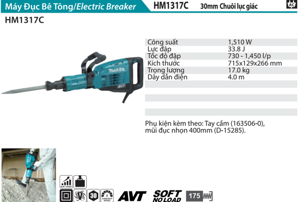 Máy đục bê tông Makita HM1317C chính là lựa chọn hàng đầu dành cho các nhà thầu và thợ chuyên nghiệp. Với công suất ấn tượng và năng lượng va đập lên tới 33.8J, HM1317C dễ dàng đục phá các khối bê tông, gạch, đá và nhựa đường một cách nhanh chóng. Điểm nổi bật của dòng máy này là công nghệ chống rung AVT (Anti-Vibration Technology)
