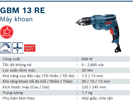 MÁY KHOAN SẮT 13MM/600W BOSCH GBM 13RE CHÍNH HÃNG GIÁ TỐT