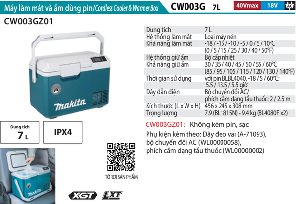 Thùng giữ nhiệt dùng pin Makita CW003GZ01 dung tích 7L, hoạt động linh hoạt với pin XGT 40V Max, LXT 18V hoặc nguồn điện AC/DC. Thiết kế nhỏ gọn, khả năng làm lạnh đến -18 độ C và giữ ấm đến 60 độ C, lý tưởng cho công trình hoặc dã ngoại. Hàng chính hãng Makita, độ bền cao, màn hình LED hiển thị nhiệt độ chính xác.