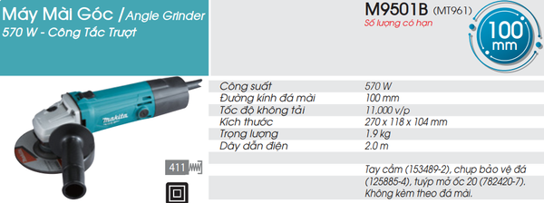 Máy mài góc Makita M9501B (570W, đĩa 100mm) là công cụ đa năng, lý tưởng cho việc cắt, mài, đánh bóng kim loại và vật liệu xây dựng. Máy sở hữu công suất 570W mạnh mẽ, tốc độ 11.000 v/p, cùng thiết kế nhỏ gọn 1.9kg, dễ thao tác. Công tắc trượt và tính năng cách điện kép giúp công việc an toàn, hiệu quả.
