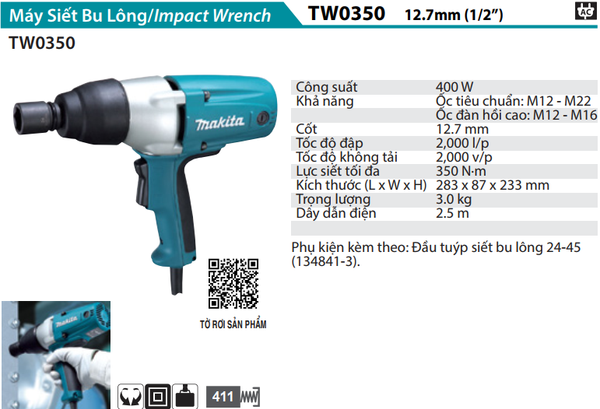 MÁY SIẾT BU LÔNG 12/7MM/400W MAKITA TW0350 CHÍNH HÃNG GIÁ TỐT